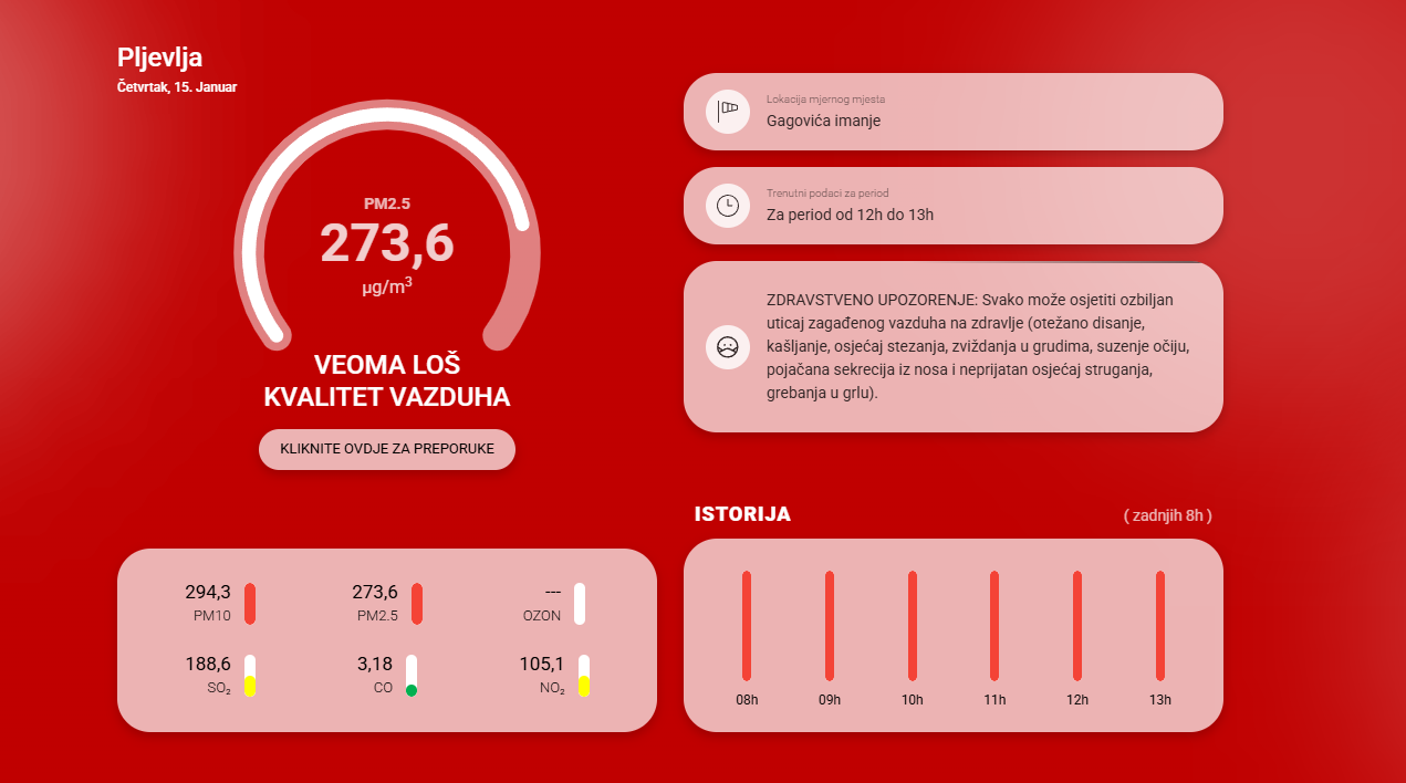 Kvalitet vazduha u Pljevljima je nedopustivo loš, sa ekstremno visokim koncentracijama štetnih čestica. Građani su upozoreni na opasnosti po zdravlje i potrebu za hitnim akcijama.