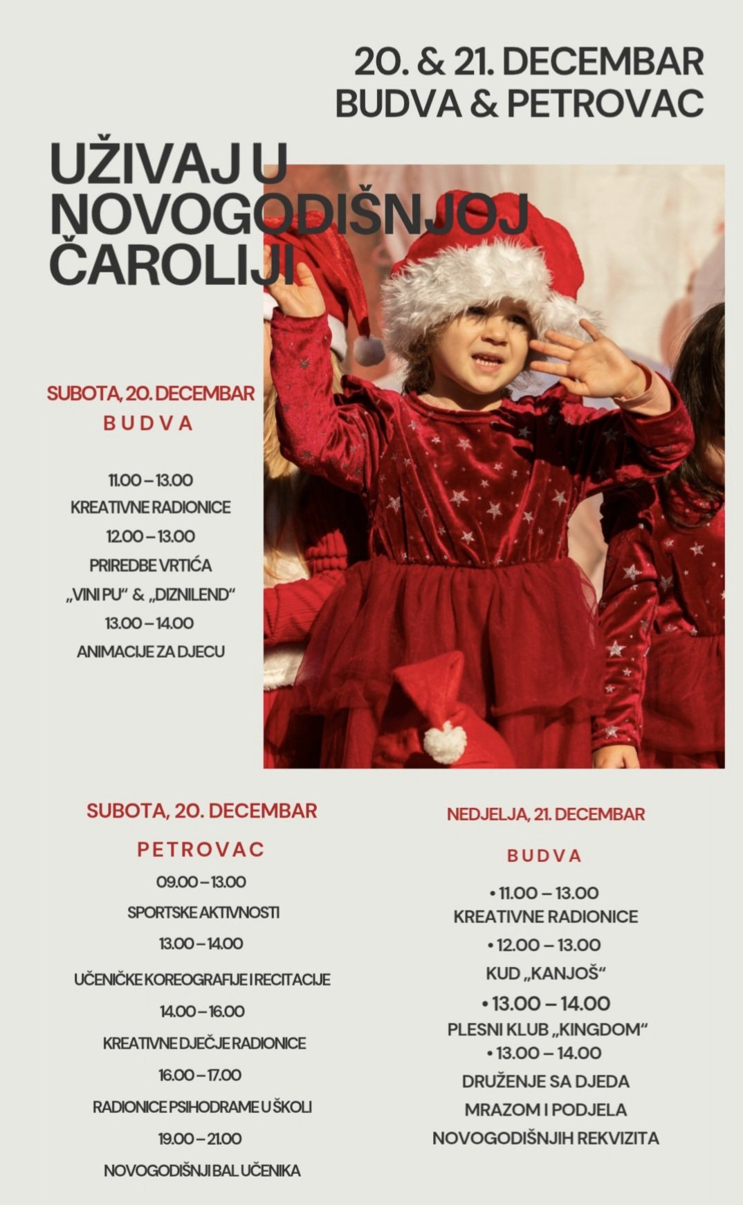 Budva i Petrovac će, bez sumnje, postati prava zimska bajka, a program je osmišljen tako da svako nađe nešto za sebe. Očekuje se veliki broj posjetilaca koji će uživati u čarima prazničnog duha i blagdanske radosti.