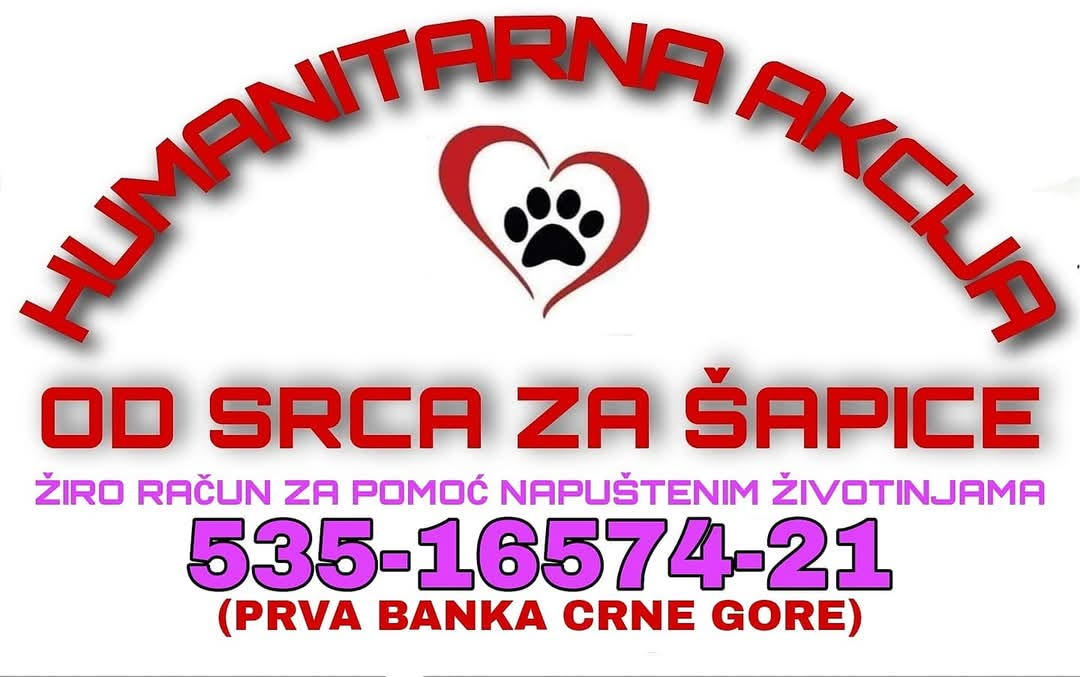 U Crnoj Gori se nastavlja humanitarna akcija pod nazivom 'Od srca za šapice', koju organizuje nevladina udruga 'Prijatelji životinja'. Ova akcija ima za cilj da prikupi sredstva za hranu i liječenje napuštenih životinja, kojih iz dana u dan ima sve više. Organizatori pozivaju građane, institucije i privrednike da se priključe i pomognu na bilo koji način.