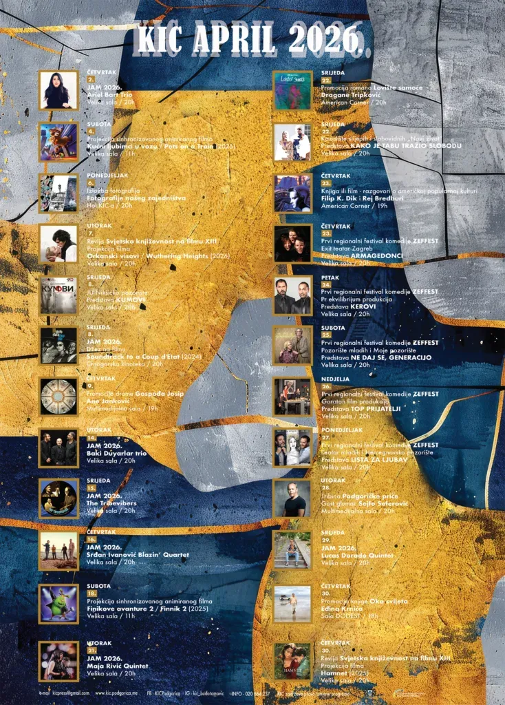 Kulturno-informativni centar 'Budo Tomović' obogaćuje kulturnu ponudu Glavnog grada raznovrsnim programima tokom aprila. Očekuju se koncerti, filmske projekcije i književne promocije.