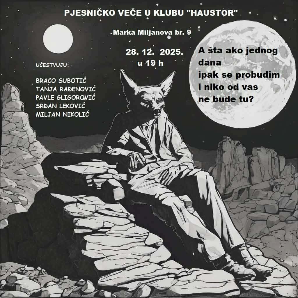 U nedjelju, 28. decembra, sa početkom u 19 časova, klub 'Haustor' će postati središte kreativnosti i inspiracije. Pjesničko veče pod nazivom 'A šta ako jednog dana ipak se probudim i niko od vas ne bude tu?' okupit će petoro talentovanih pjesnika iz Crne Gore.