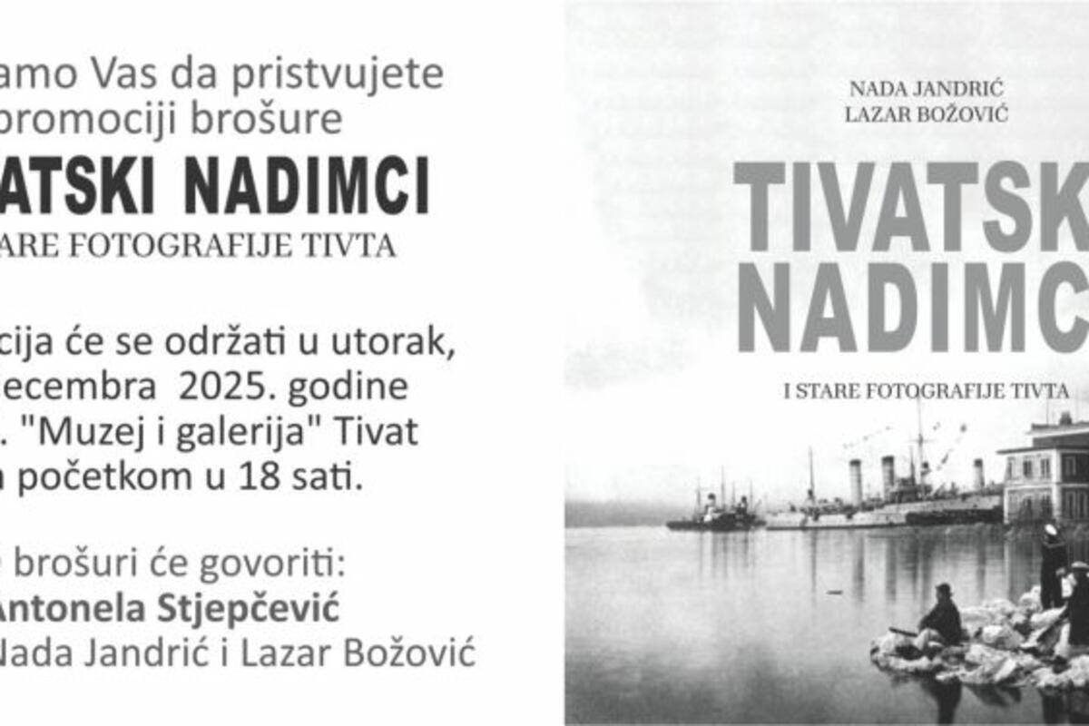 U JU Muzej i galerija Tivat, sjutra u 18 časova, biće održana promocija brošure pod nazivom 'Tivatski nadimci i stare fotografije Tivta'. Ova vrijedna publikacija je rezultat rada autora Nade Jandrić i Lazara Božovića, koji su istražili bogatu kulturnu baštinu Tivta.