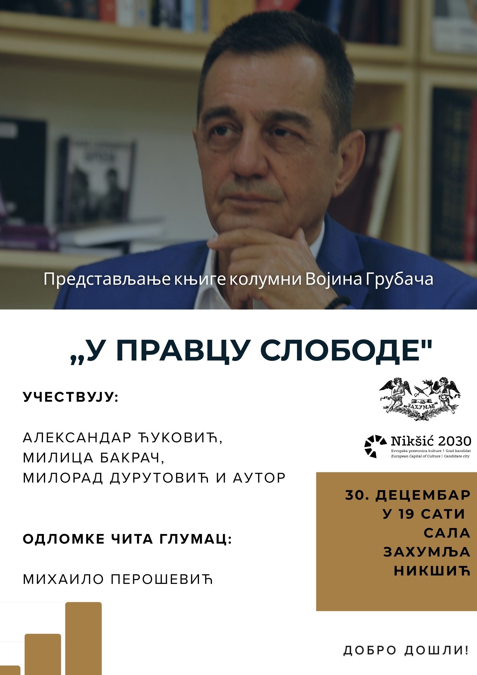 U Nikšiću će se 30. decembra održati promocija knjige "U pravcu slobode – kolumne i komentari (2020–2022)" Voijina Grubače. Ovaj događaj zaokružiće bogat kulturni program JU "Zahumlje" za 2025. godinu.