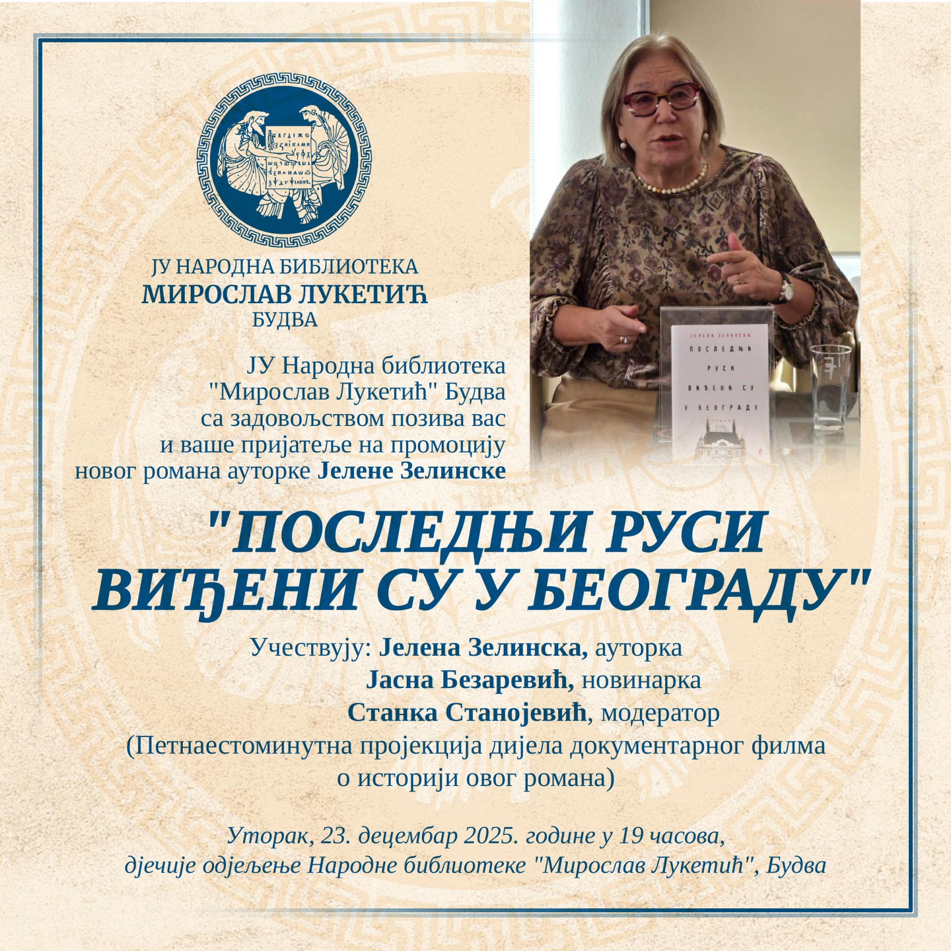U Narodnoj biblioteci 'Miroslav Luketić' u Budvi, večeras od 19 časova, biće održana promocija romana 'Poslednji Rusi viđeni su u Beogradu' autorice Jelene Zelinske. Ovaj roman, koji je već privukao pažnju čitalačke publike, istražuje složene odnose i sudbine likova u turbulentnim vremenima.