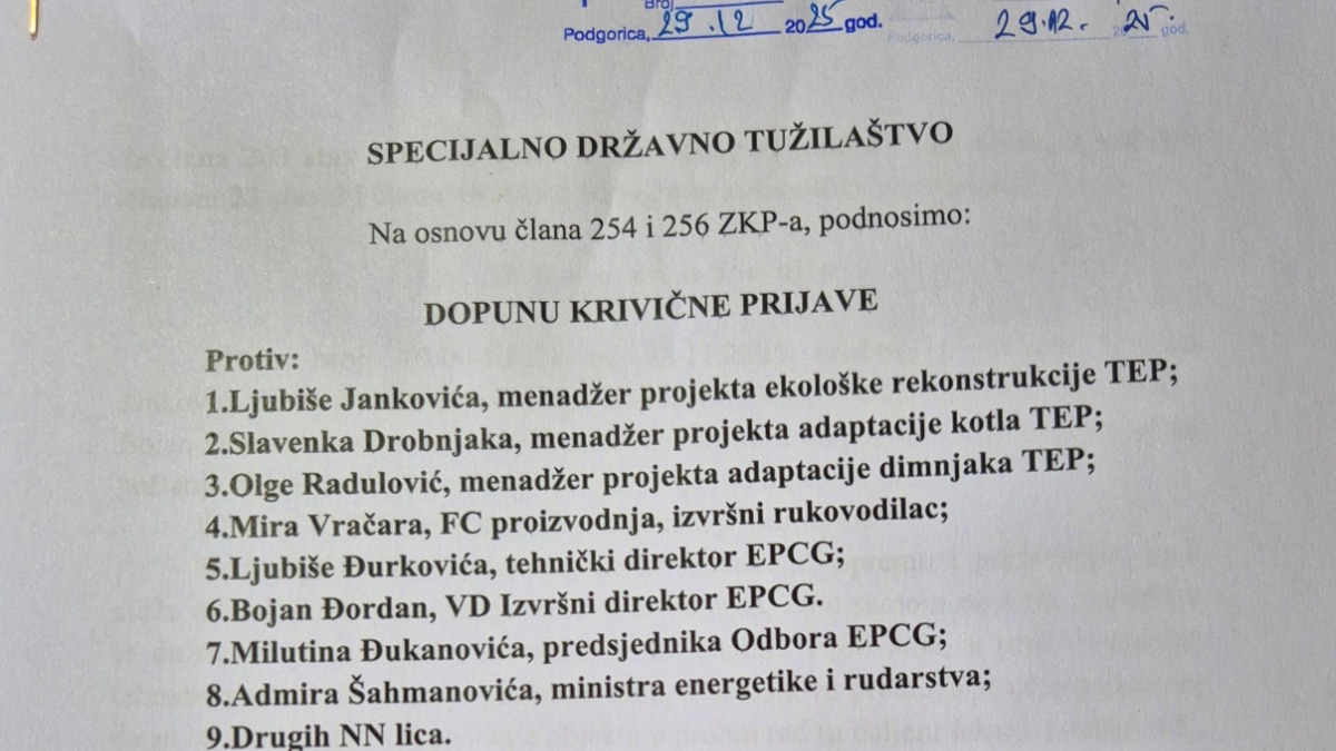Građanski pokret URA podnio je dopunu krivične prijave protiv funkcionera Elektroprivrede Crne Gore. Optužuju ih za puštanje u rad Termoelektrane koja je dovela do ekstremne zagađenosti vazduha i ugrozila zdravlje građana Pljevalja.
